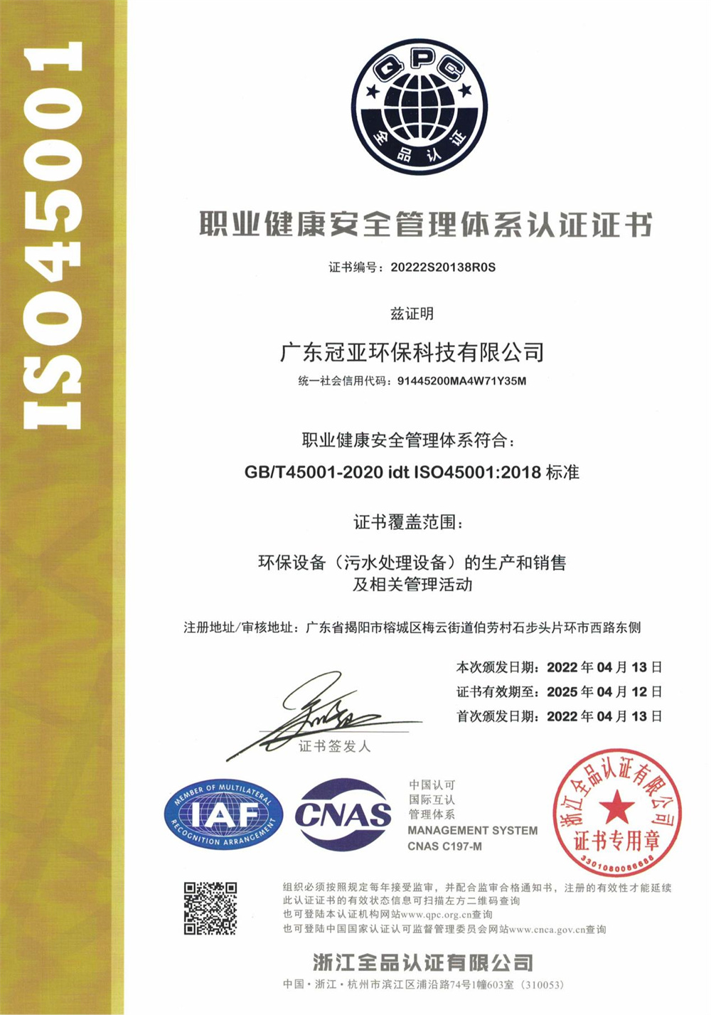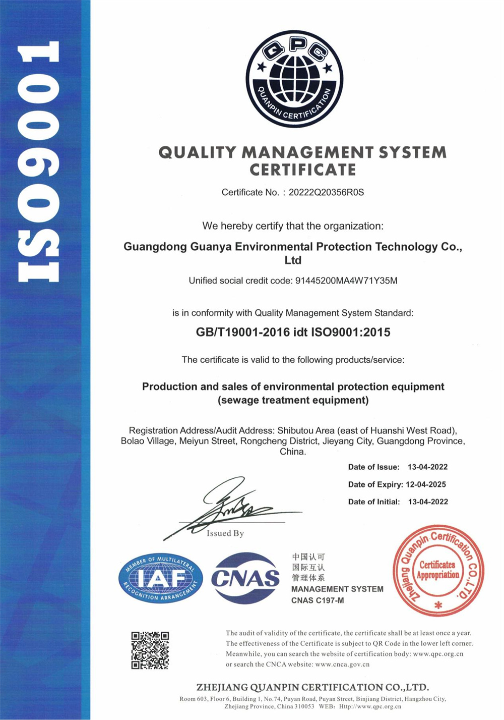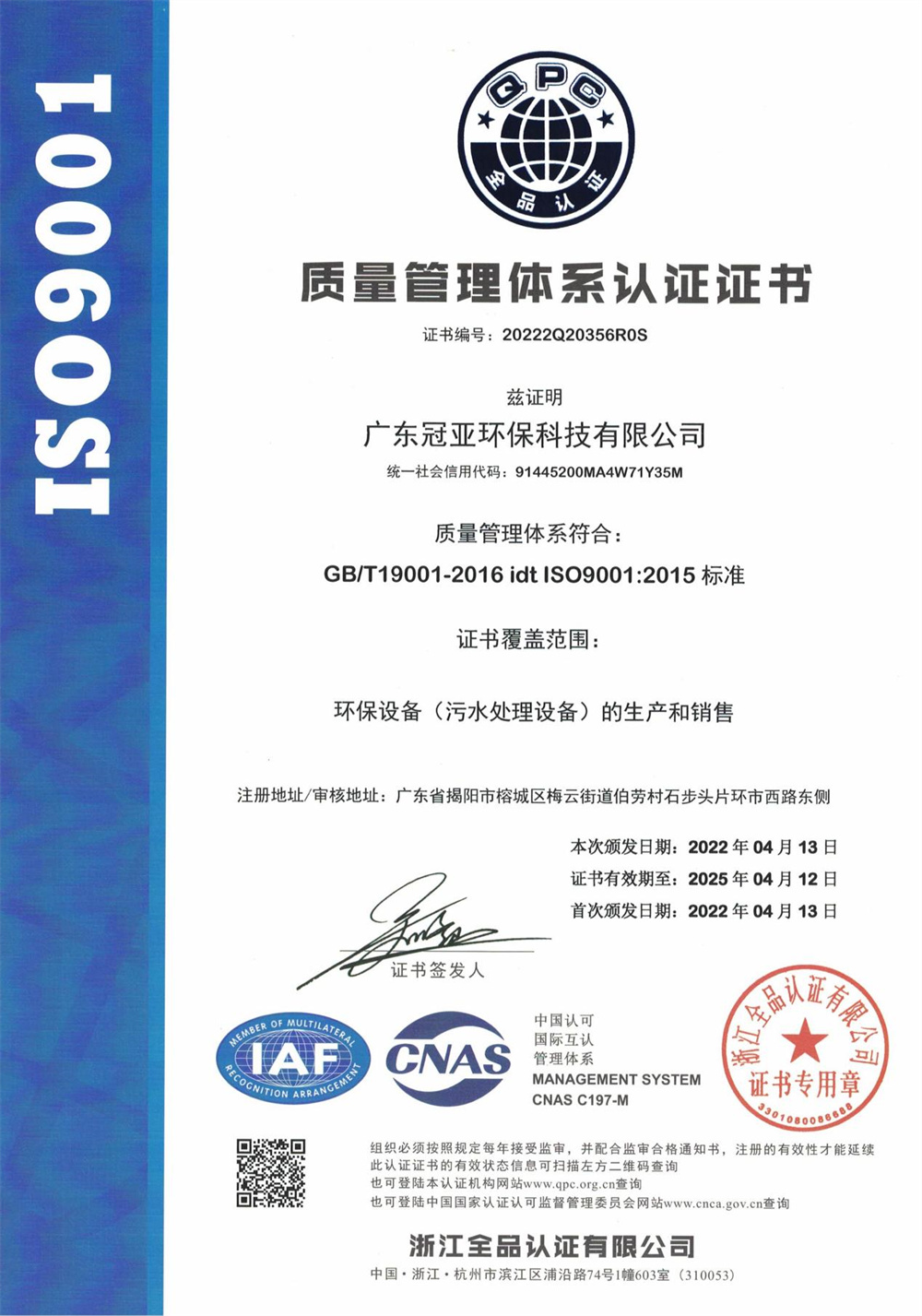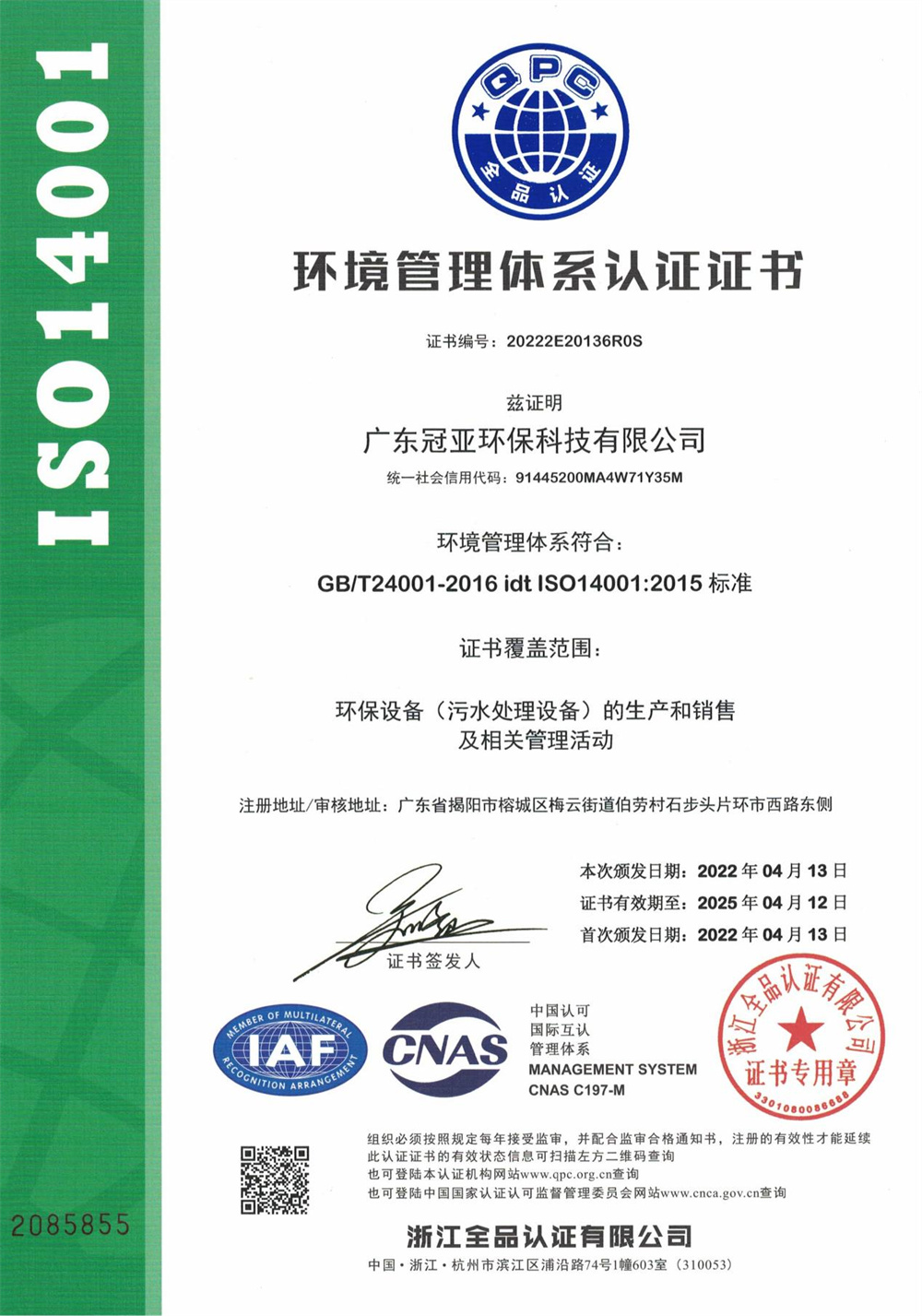 環境管理體系認證證書